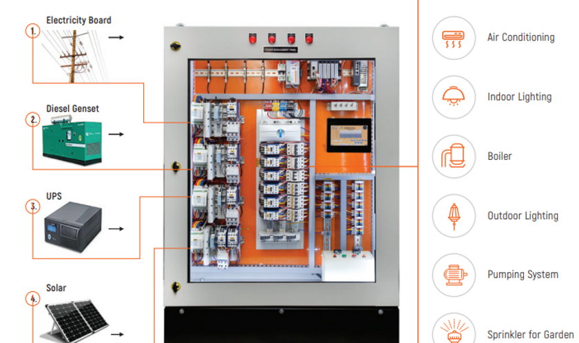 The smart electrical panel designed as per IEC 61439 Standards provides unmatched safety for electric power distribution. It connects various power sources to a single point, with PLC controls for switching the source.